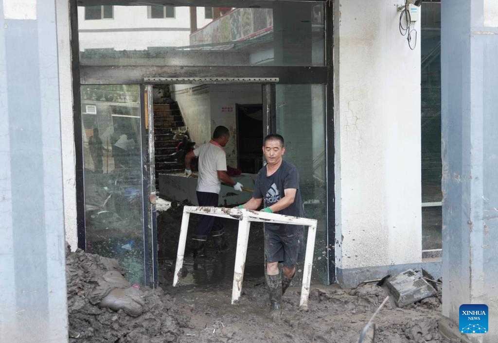 Villagers clean a house in Xiazhuang Village, Sanpo Town, Laishui County, in north China's Hebei Province, Aug. 8, 2023. Affected by Typhoon Doksuri, Laishui County suffered heavy rainfall recently and some villages encountered traffic and communication disruptions. At present, the local authorities are mending infrastructure damaged by flood to bring life back to normal as soon as possible. (Xinhua/Yang Shiyao)