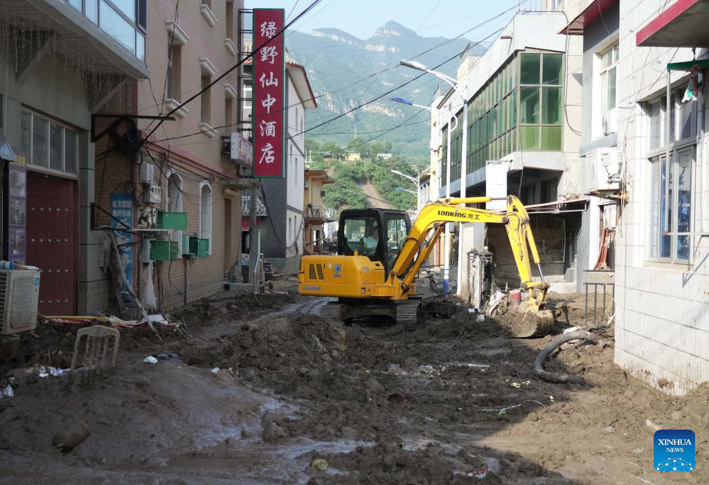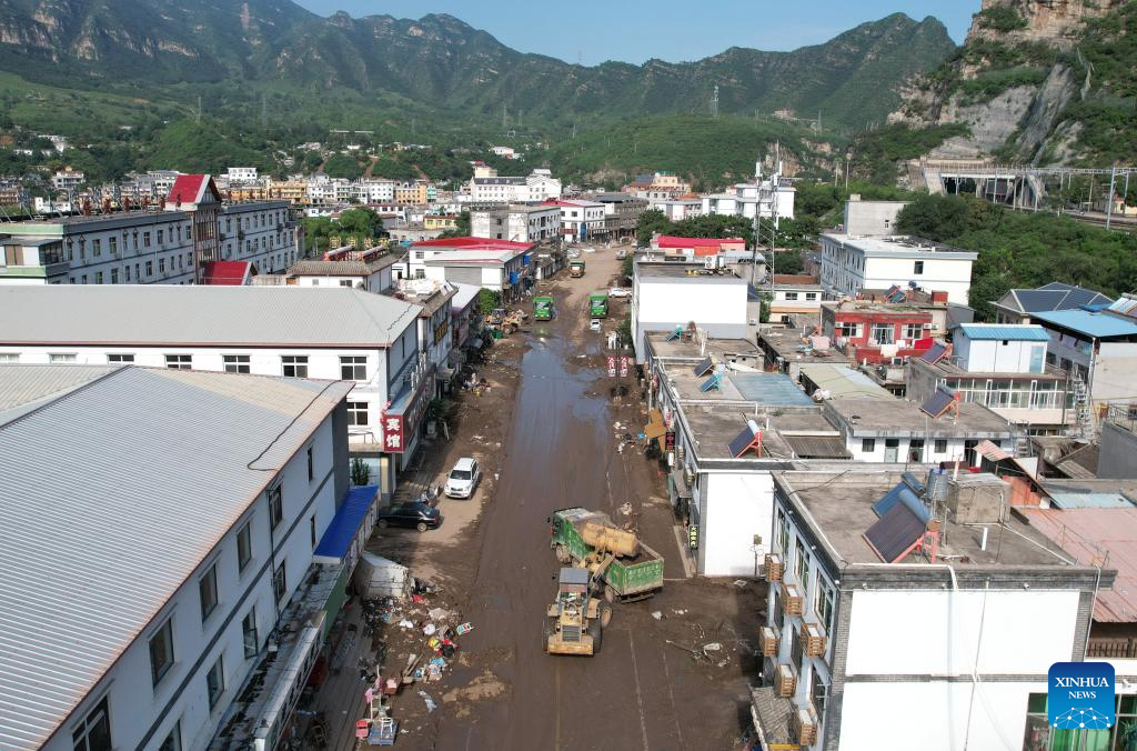 This aerial photo shows workers operating machinery to clean up silt on the road in Xiazhuang Village, Sanpo Town, Laishui County, in north China's Hebei Province, Aug. 8, 2023. Affected by Typhoon Doksuri, Laishui County suffered heavy rainfall recently and some villages encountered traffic and communication disruptions. At present, the local authorities are mending infrastructure damaged by flood to bring life back to normal as soon as possible. (Xinhua/Yang Shiyao)