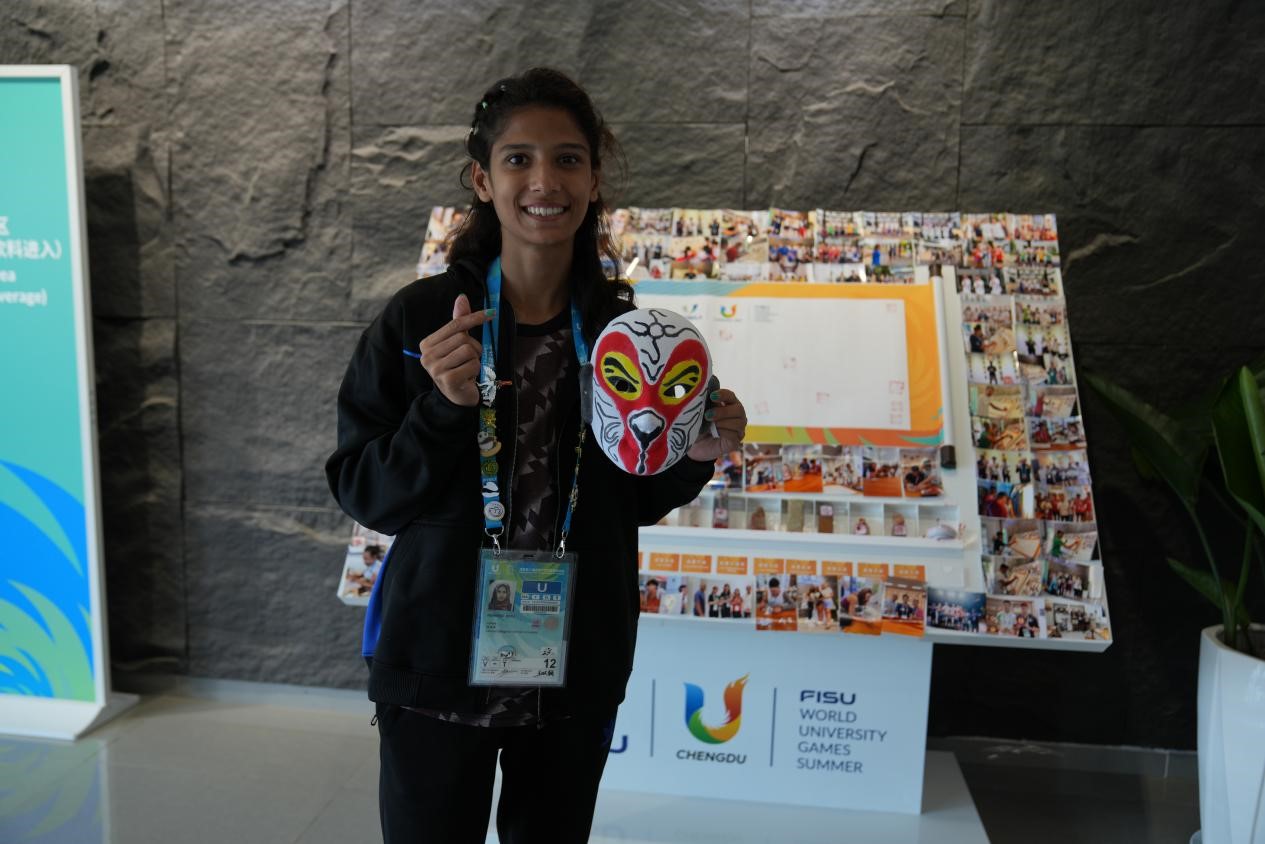 A track and field athlete from Pakistan showcases a Sichuan Opera mask she has made. (Photo/Wang Liang)