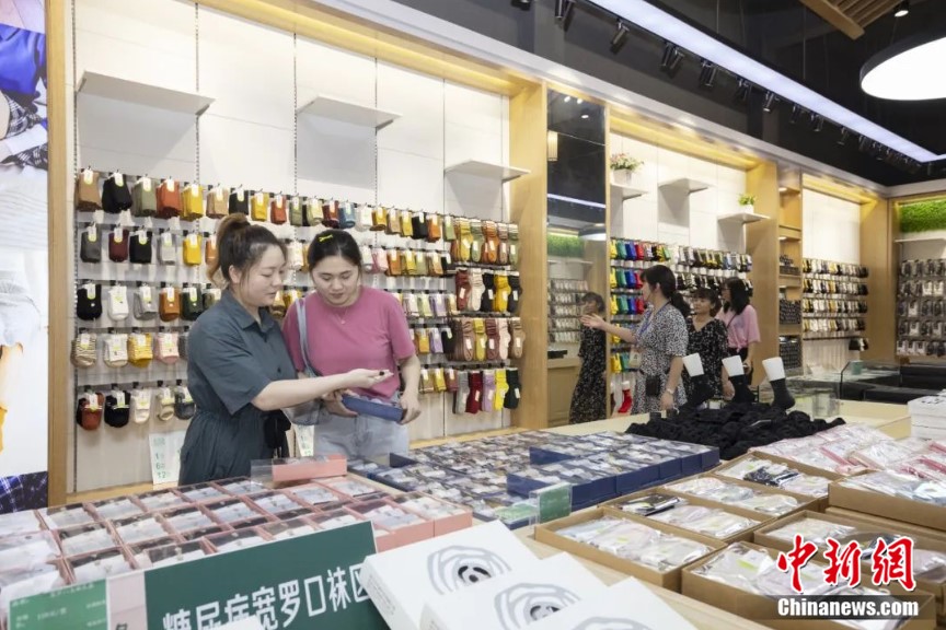 People shop at a hosiery market in Datang subdistrict of Zhuji city, east China's Zhejiang Province. Datang subdistrict is the largest hosiery production base in the world. (Photo/Datang subdistrict)