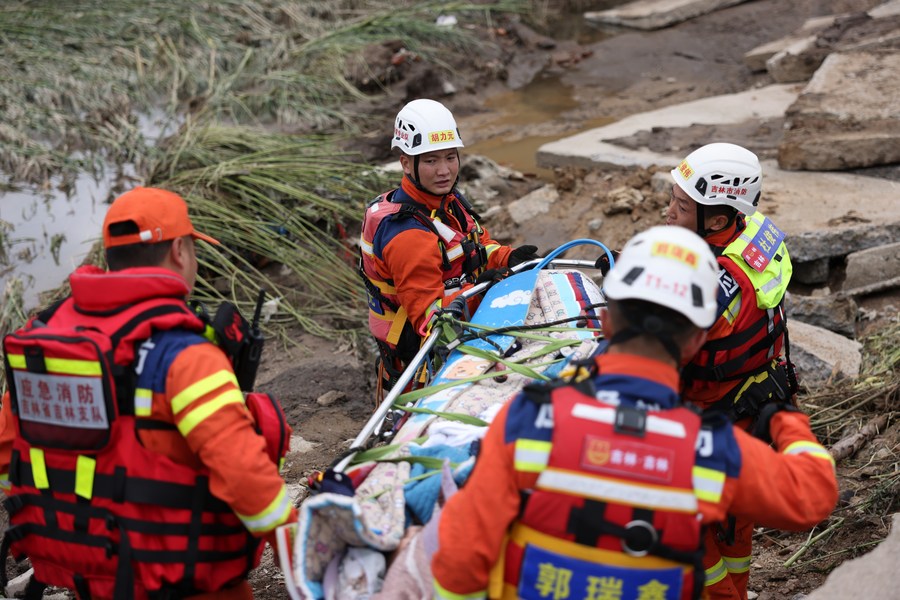 Rescuers transfer a trapped person in Shulan City, northeast China's Jilin Province, Aug. 6, 2023. (Xinhua/Yan Linyun)