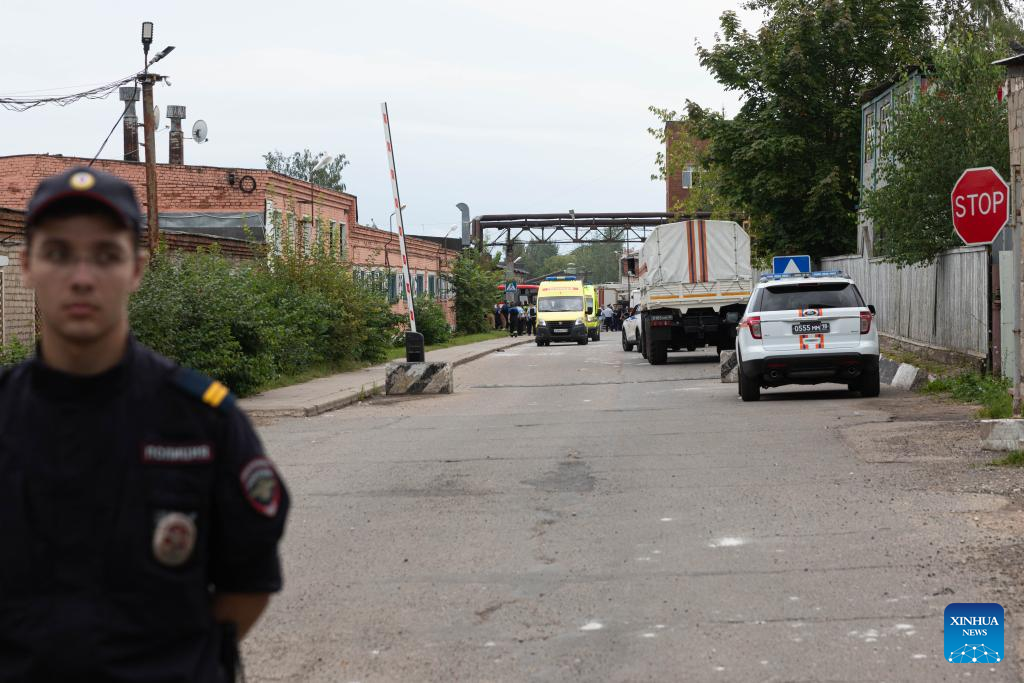 Rescuers and vehicles are seen at the blast site of a plant in Moscow region, Russia, Aug. 9, 2023. Forty-three people have been injured so far in a blast at an optical-mechanical plant in the city of Sergiev Posad in the Moscow region on Wednesday, local authorities said. The explosion happened on Wednesday morning at around 10:40 a.m. local time (0740 GMT) at a pyrotechnics warehouse, which was being rented out on the optical-mechanical plant's territory by a private company, said Governor of the Moscow Region Andrei Vorobiev in a Telegram post. (Xinhua/Bai Xueqi)