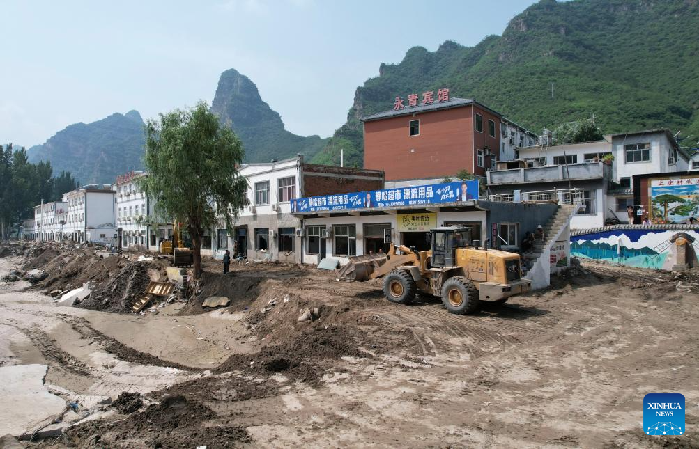 This aerial photo taken on Aug. 9, 2023 shows a worker operating machinery to repair a road leading to Shangzhuang Village of Sanpo Town, Laishui County, north China's Hebei Province. Some roads blocked by the rain-triggered floods in the county are repaired, and electricity and communication services are restored. (Xinhua/Yang Shiyao)