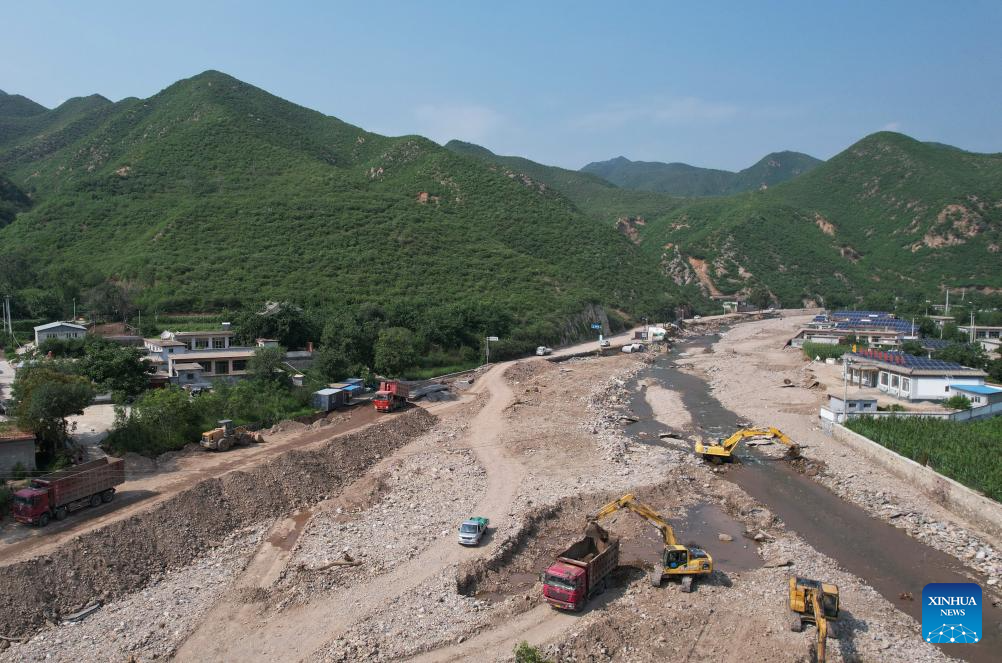 This aerial photo taken on Aug. 9, 2023 shows workers operating machinery to repair a road leading to Shannan Village of Jiulong Town, Laishui County, north China's Hebei Province. Some roads blocked by the rain-triggered floods in the county are repaired, and electricity and communication services are restored. (Xinhua/Yang Shiyao)