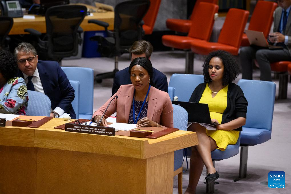Edem Wosornu (Front), director of operations and advocacy in the Office for the Coordination of Humanitarian Affairs (OCHA), speaks at a UN Security Council meeting on Sudan at the UN headquarters in New York, on Aug. 9, 2023. Sudan is falling into a deeper humanitarian catastrophe, the UN humanitarian official warned on Wednesday. (Loey Felipe/UN Photo/Handout via Xinhua)