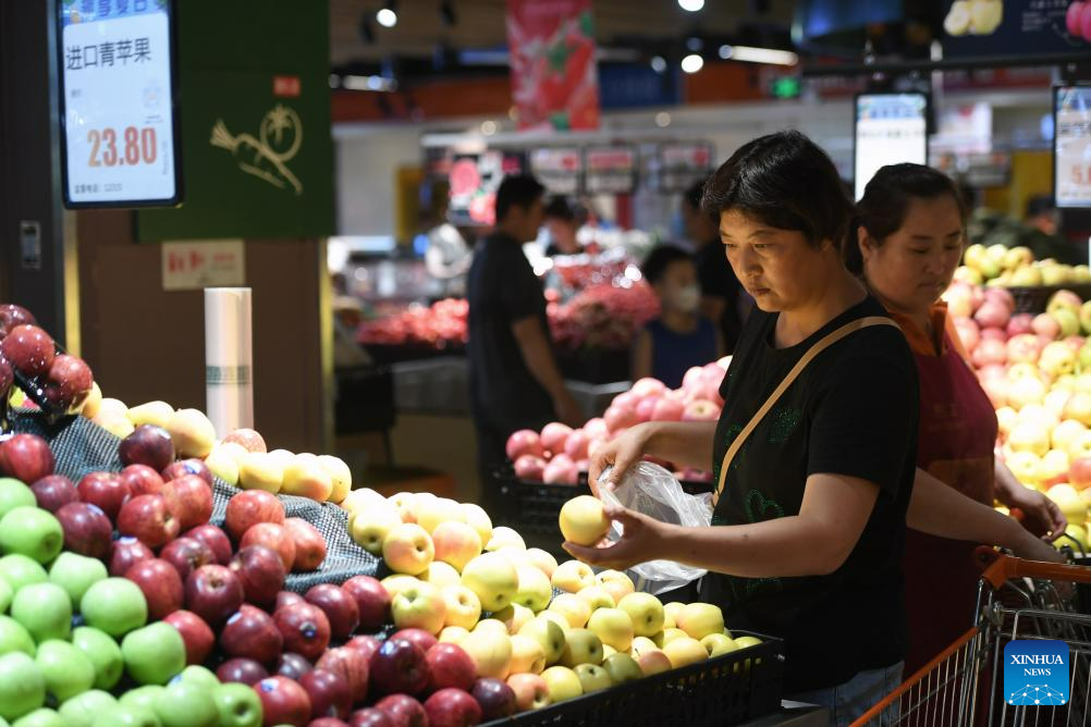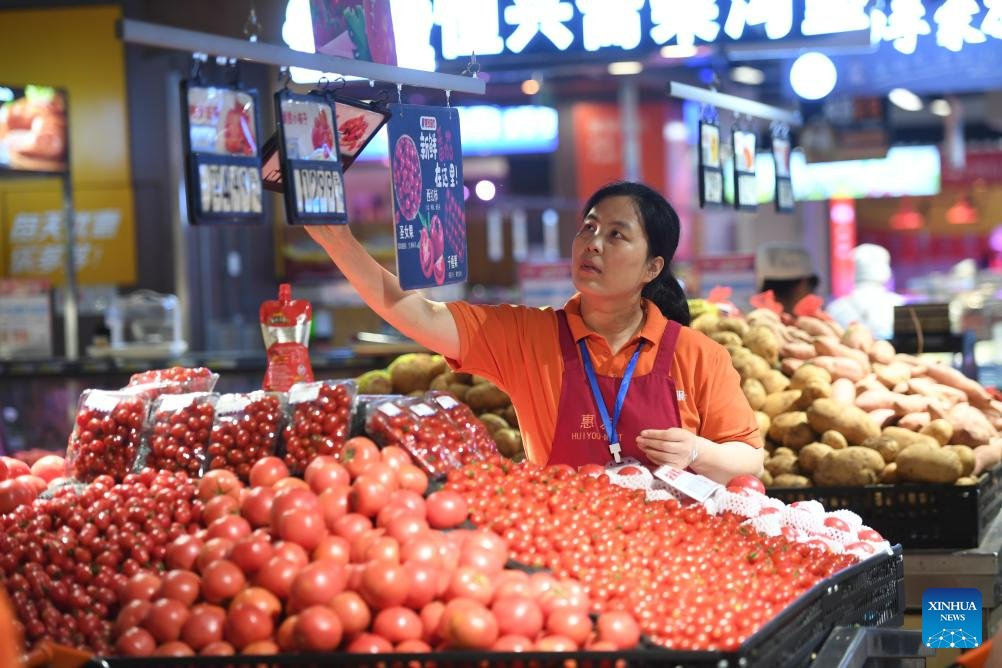 Citizens select fruits at a supermarket in Zhuozhou, north China's Hebei Province, Aug. 10, 2023. Some markets, supermarkets and shopping malls have been returned to normal operation after the floodwater receded in Zhuozhou. At present, the supply of daily necessities in the city has been adequate with stable price. (Xinhua/Zhu Xudong)