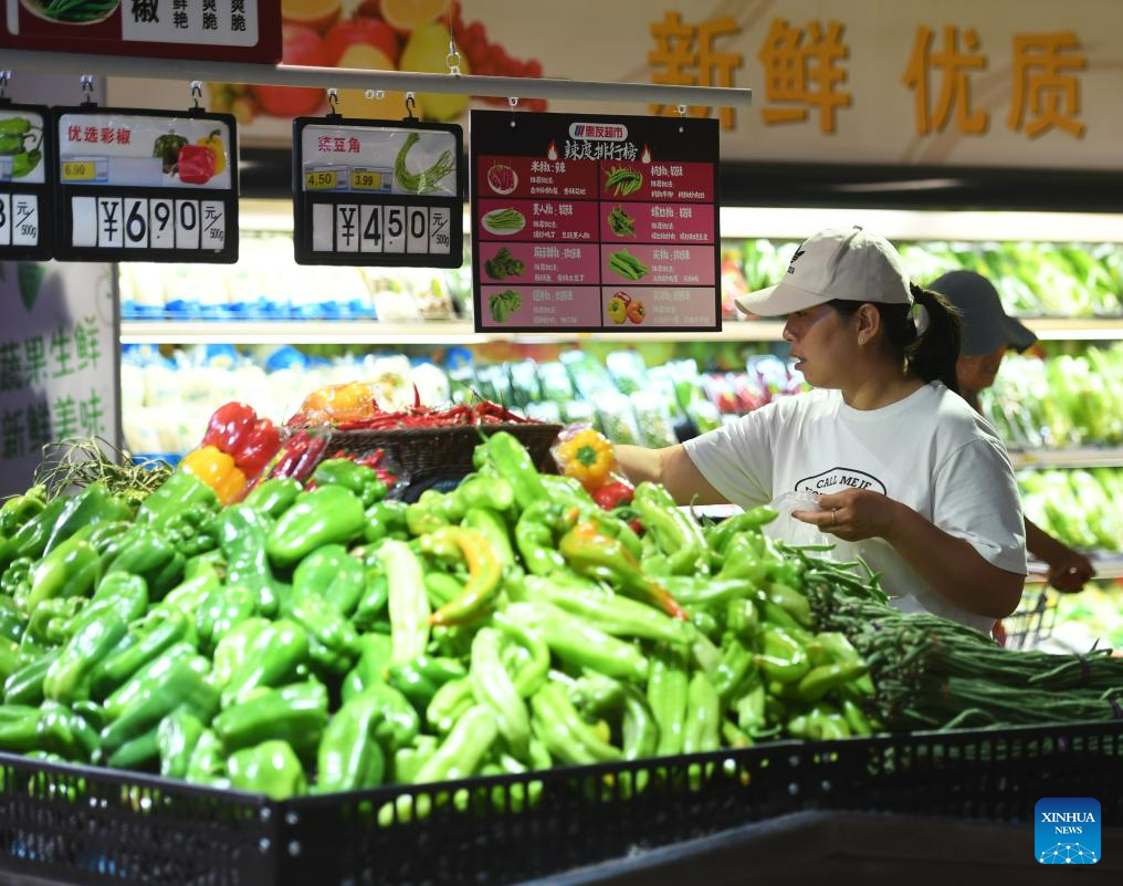 Citizens select vegetables at a supermarket in Zhuozhou, north China's Hebei Province, Aug. 10, 2023. Some markets, supermarkets and shopping malls have been returned to normal operation after the floodwater receded in Zhuozhou. At present, the supply of daily necessities in the city has been adequate with stable price. (Xinhua/Zhu Xudong)