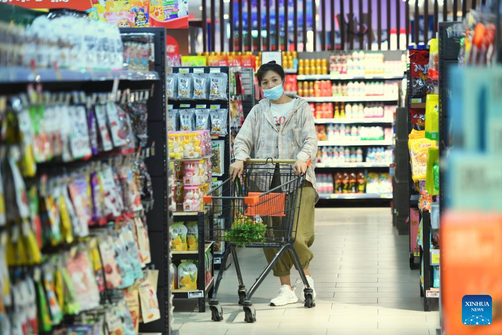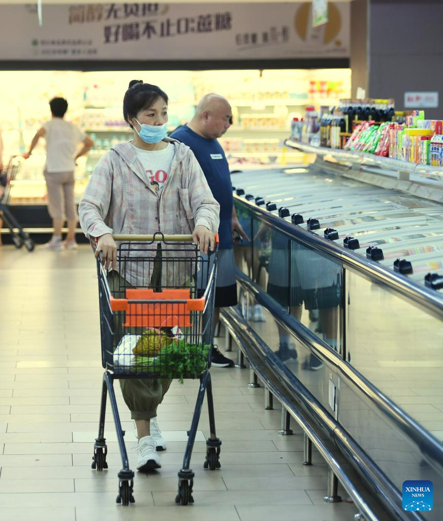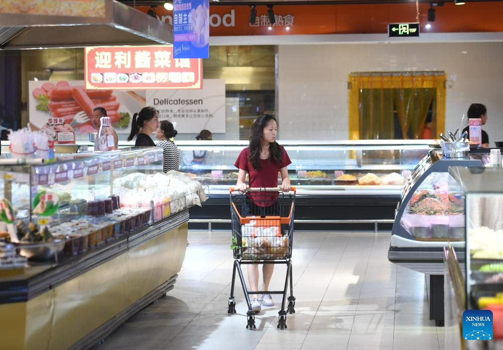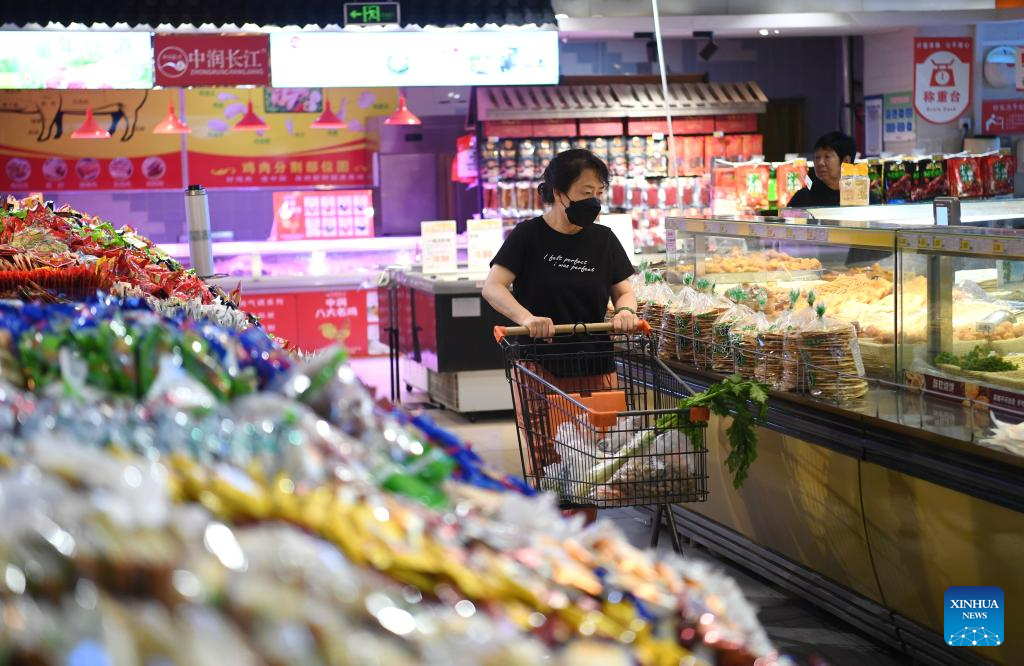 A citizen shops at a supermarket in Zhuozhou, north China's Hebei Province, Aug. 10, 2023. Some markets, supermarkets and shopping malls have been returned to normal operation after the floodwater receded in Zhuozhou. At present, the supply of daily necessities in the city has been adequate with stable price. (Xinhua/Zhu Xudong)