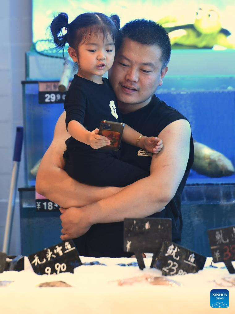 Citizens select seafood at a supermarket in Zhuozhou, north China's Hebei Province, Aug. 10, 2023. Some markets, supermarkets and shopping malls have been returned to normal operation after the floodwater receded in Zhuozhou. At present, the supply of daily necessities in the city has been adequate with stable price. (Xinhua/Zhu Xudong)