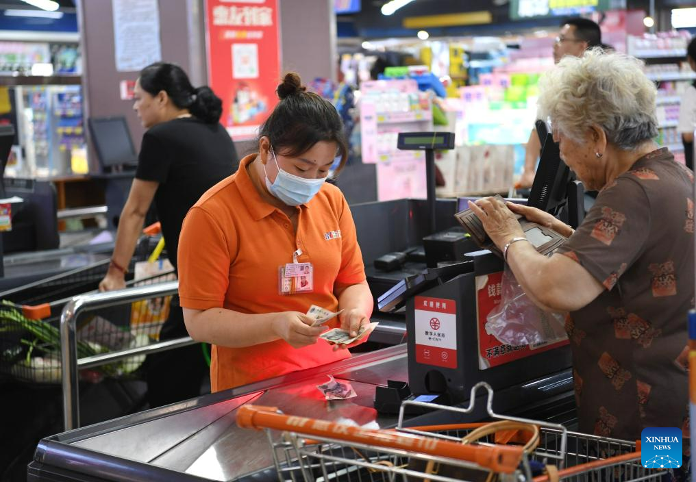 A customer pays at the checkout counter of a supermarket in Zhuozhou, north China's Hebei Province, Aug. 10, 2023. Some markets, supermarkets and shopping malls have been returned to normal operation after the floodwater receded in Zhuozhou. At present, the supply of daily necessities in the city has been adequate with stable price. (Xinhua/Zhu Xudong)