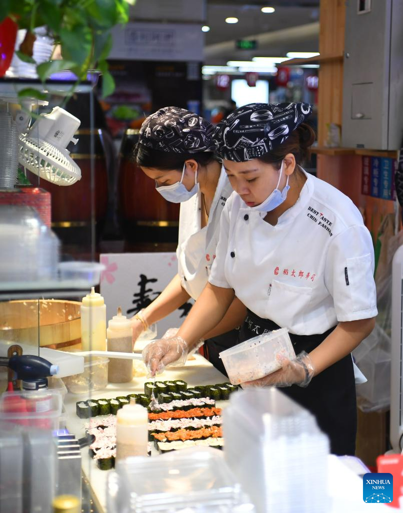 Staff members make sushi at a supermarket in Zhuozhou, north China's Hebei Province, Aug. 10, 2023. Some markets, supermarkets and shopping malls have been returned to normal operation after the floodwater receded in Zhuozhou. At present, the supply of daily necessities in the city has been adequate with stable price. (Xinhua/Zhu Xudong)