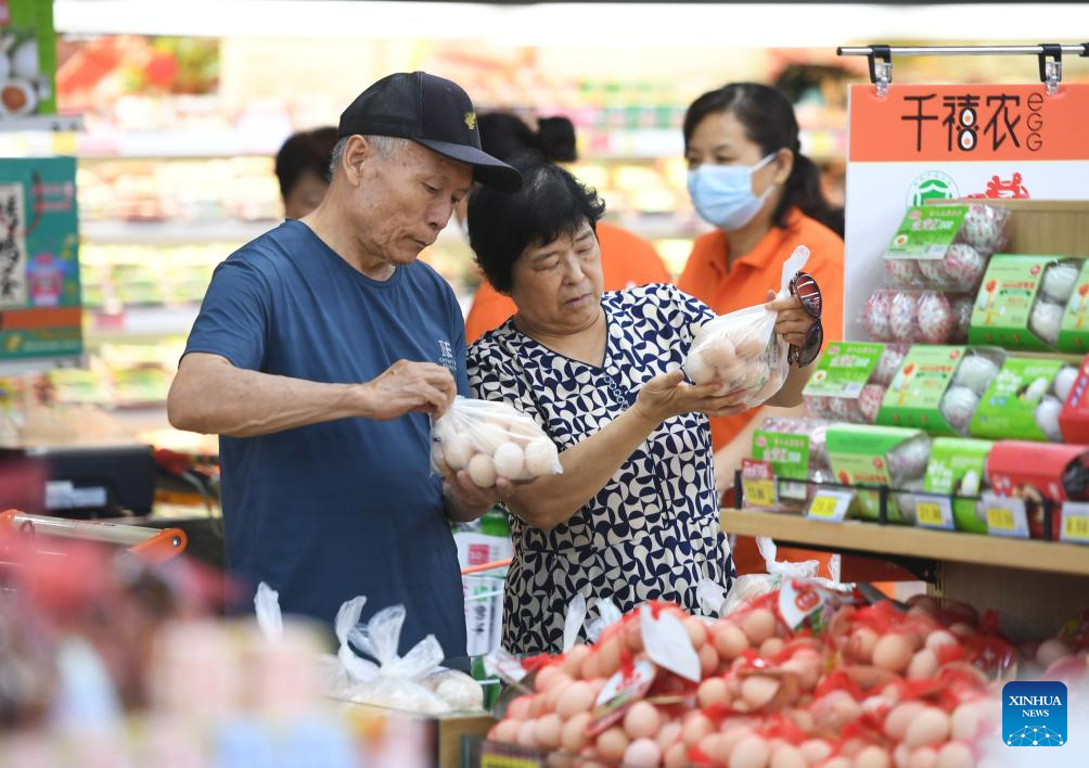 Citizens select eggs at a supermarket in Zhuozhou, north China's Hebei Province, Aug. 10, 2023. Some markets, supermarkets and shopping malls have been returned to normal operation after the floodwater receded in Zhuozhou. At present, the supply of daily necessities in the city has been adequate with stable price. (Xinhua/Zhu Xudong)
