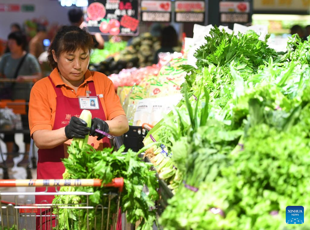 A staff member sorts out vegetables at a supermarket in Zhuozhou, north China's Hebei Province, Aug. 10, 2023. Some markets, supermarkets and shopping malls have been returned to normal operation after the floodwater receded in Zhuozhou. At present, the supply of daily necessities in the city has been adequate with stable price. (Xinhua/Zhu Xudong)