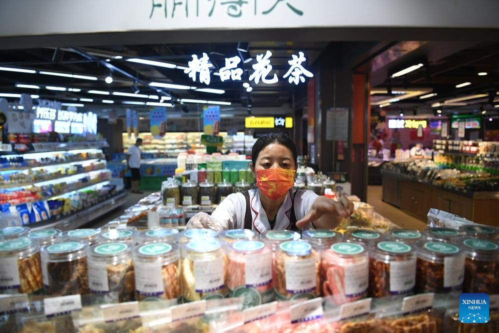 A staff member arranges commodities at a supermarket in Zhuozhou, north China's Hebei Province, Aug. 10, 2023. Some markets, supermarkets and shopping malls have been returned to normal operation after the floodwater receded in Zhuozhou. At present, the supply of daily necessities in the city has been adequate with stable price. (Xinhua/Zhu Xudong)