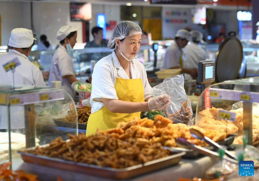 A staff member packs food for customers at a supermarket in Zhuozhou, north China's Hebei Province, Aug. 10, 2023. Some markets, supermarkets and shopping malls have been returned to normal operation after the floodwater receded in Zhuozhou. At present, the supply of daily necessities in the city has been adequate with stable price. (Xinhua/Zhu Xudong)
