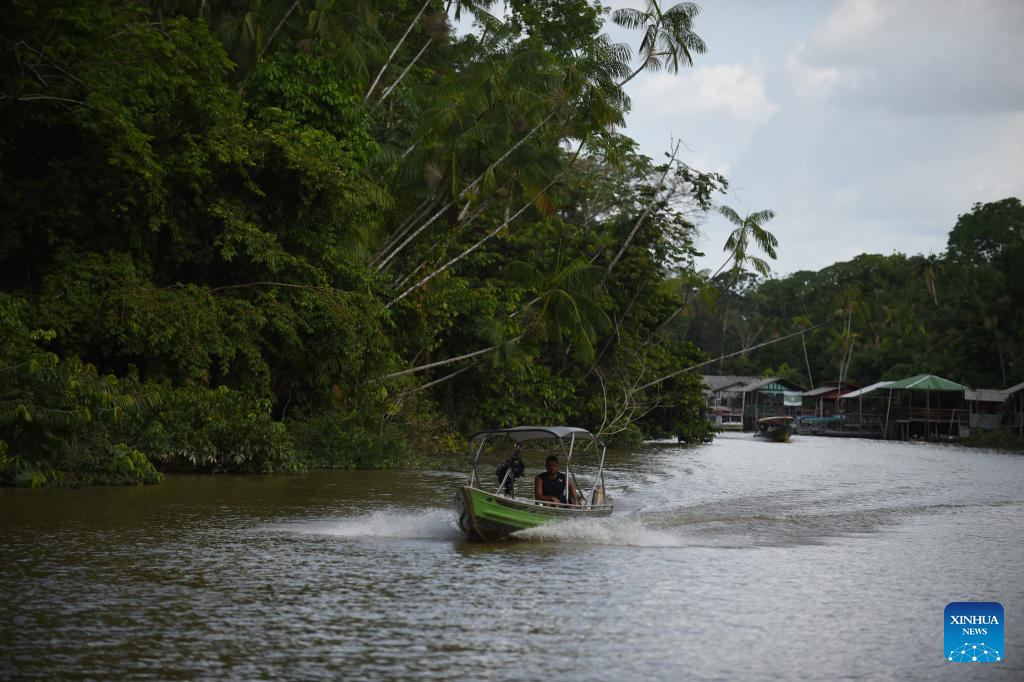 This photo taken on Aug. 8, 2023 shows a boat sailing on a river in Belem, Brazil. Brazilian President Luiz Inacio Lula da Silva criticized Wednesday what he called "green neocolonialism" and demanded funding commitments from developed countries for sustainable projects. (Photo by Lucio Tavora/Xinhua)