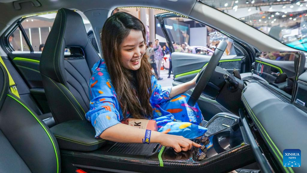 A visitor sits inside a NETA car displayed at the Gaikindo Indonesia International Auto Show (GIIAS) 2023 in Tangerang of Banten province, Indonesia, Aug. 10, 2023. Chinese electric vehicle manufacturer Hozon Auto officially introduced NETA in Indonesia on Thursday at the GIIAS 2023. (Photo by Fajar Septian/Xinhua)