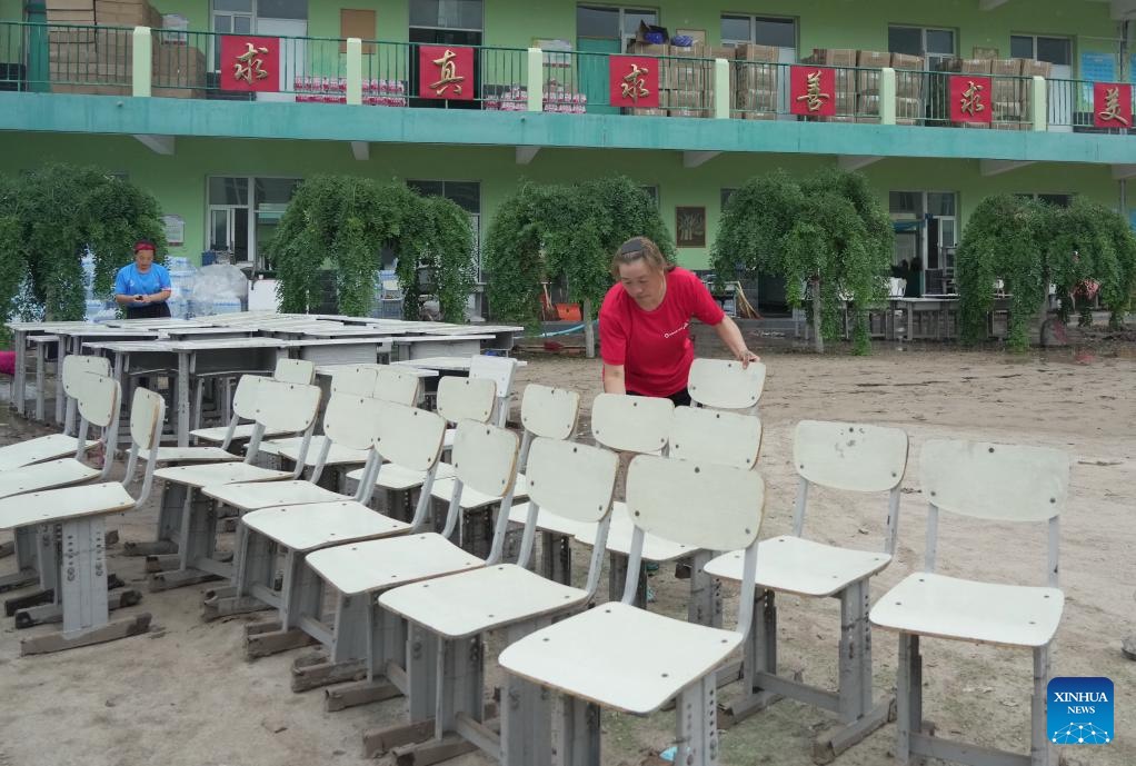 A teacher wipes chairs at a school in Qizhongkou Town of Laishui County, north China's Hebei Province, Aug. 11, 2023. Some schools, located in the mountainous areas of Laishui County, have carried out post-flood recovery work recently. Relevant personnel have investigated schools thoroughly for potential safety hazards, cleaned campuses and carried out disinfection for epidemic prevention and control. (Xinhua/Yang Shiyao)