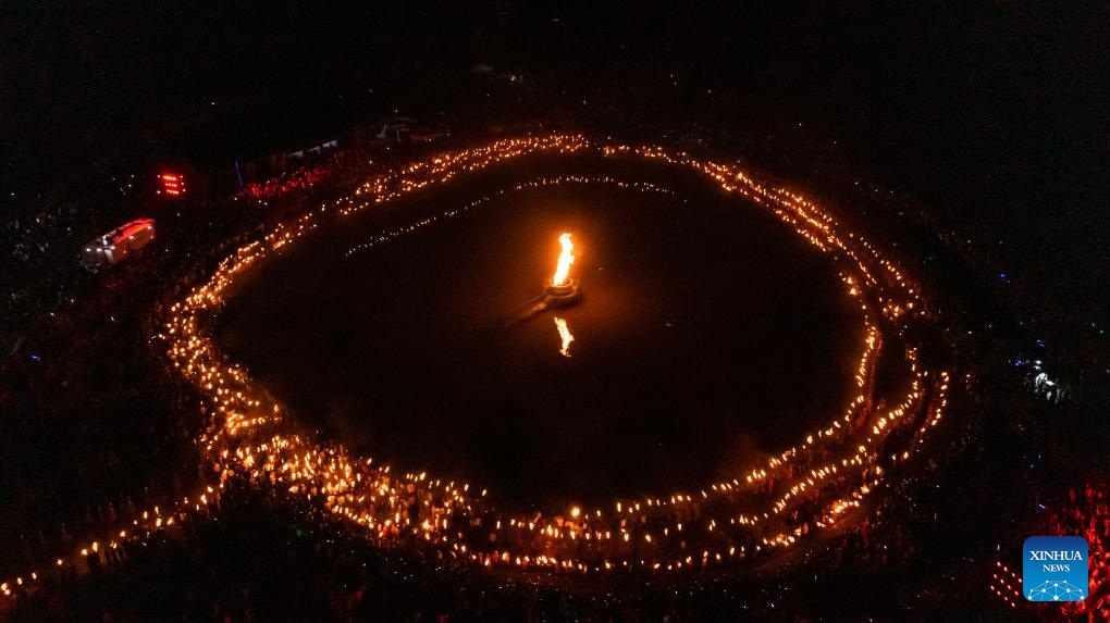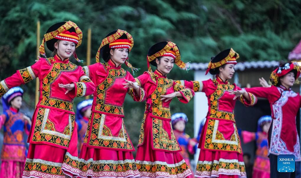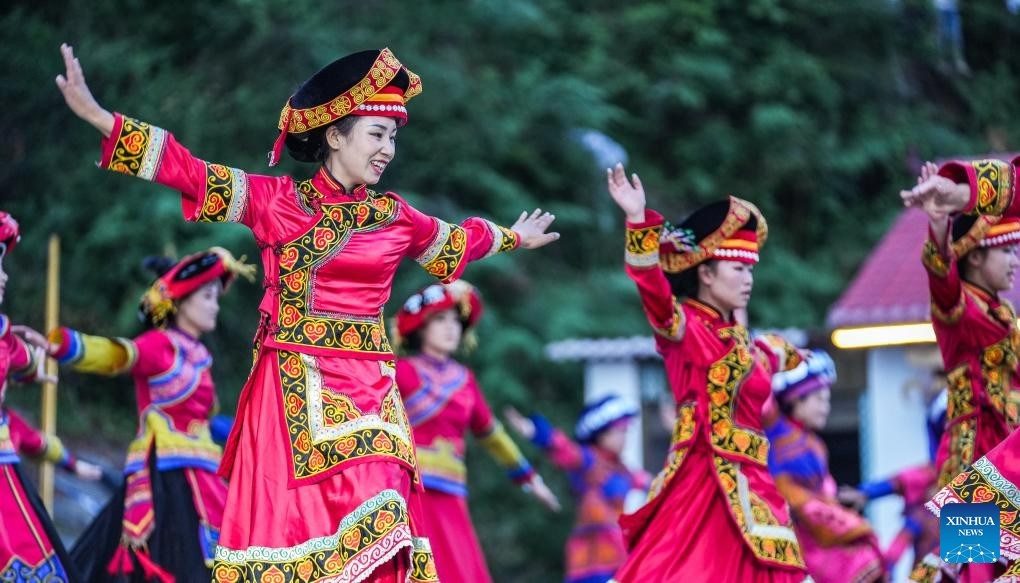 Actors perform during celebration events of the Torch Festival in Yi-Hui-Miao Autonomous County of Weining, southwest China's Guizhou Province, Aug. 10, 2023. In celebration of the Torch Festival, a series of events were organized in Weining from Aug. 3 to Aug. 10. These events, featuring campfire parties, traditional ethnic sports competitions and performances, attracted visitors with a festive atmosphere full of local characteristics. (Xinhua/Tao Liang)