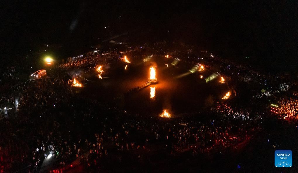 This aerial photo taken on Aug. 10, 2023 shows a scene of a campfire party in Bandi Township of Yi-Hui-Miao Autonomous County of Weining, southwest China's Guizhou Province. In celebration of the Torch Festival, a series of events were organized in Weining from Aug. 3 to Aug. 10. These events, featuring campfire parties, traditional ethnic sports competitions and performances, attracted visitors with a festive atmosphere full of local characteristics. (Xinhua/Tao Liang)