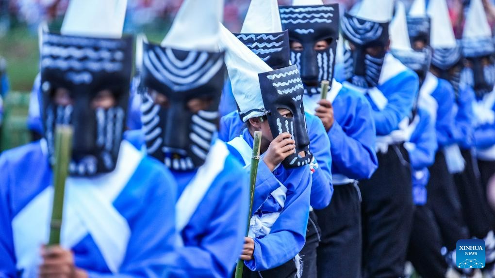 Children perform "Cuotaiji", a traditional opera of the Yi ethnic group, during celebration events of the Torch Festival in Yi-Hui-Miao Autonomous County of Weining, southwest China's Guizhou Province, Aug. 10, 2023. In celebration of the Torch Festival, a series of events were organized in Weining from Aug. 3 to Aug. 10. These events, featuring campfire parties, traditional ethnic sports competitions and performances, attracted visitors with a festive atmosphere full of local characteristics. (Xinhua/Tao Liang)