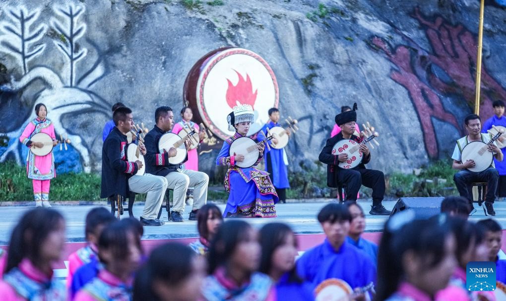 Actors play yueqin, a banjo like instrument with four-strings, during celebration events of the Torch Festival in Yi-Hui-Miao Autonomous County of Weining, southwest China's Guizhou Province, Aug. 10, 2023. In celebration of the Torch Festival, a series of events were organized in Weining from Aug. 3 to Aug. 10. These events, featuring campfire parties, traditional ethnic sports competitions and performances, attracted visitors with a festive atmosphere full of local characteristics. (Xinhua/Tao Liang)