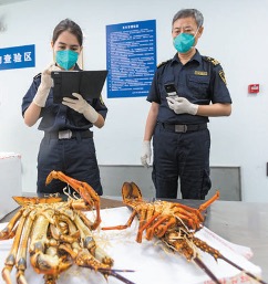 Customs staff members conduct inspections of imported lobsters at Beijing Capital International Airport in Beijing, capital of China. (Photo/Fang Xing)