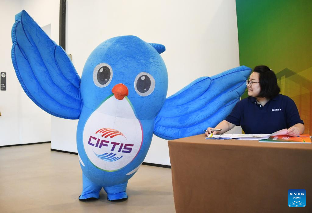 The mascot FuYan for the 2023 China International Fair for Trade in Services (CIFTIS) is seen at Shougang Park in Beijing, capital of China, Aug. 13, 2023. The 2023 CIFTIS will be held at the China National Convention Center and Shougang Park in Beijing from Sept. 2 to Sept. 6. (Xinhua/Ren Chao)