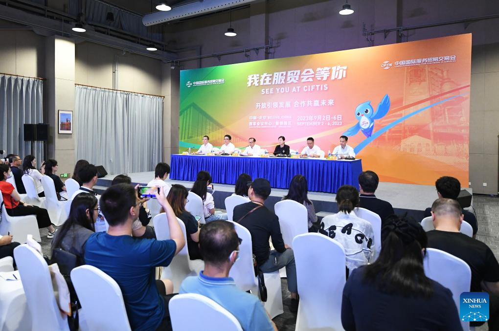 This photo taken on Aug. 13, 2023 shows a press briefing of the 2023 China International Fair for Trade in Services (CIFTIS) at Shougang Park in Beijing, capital of China. The 2023 CIFTIS will be held at the China National Convention Center and Shougang Park in Beijing from Sept. 2 to Sept. 6. (Xinhua/Ren Chao)