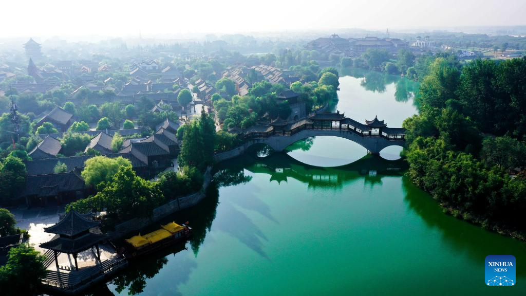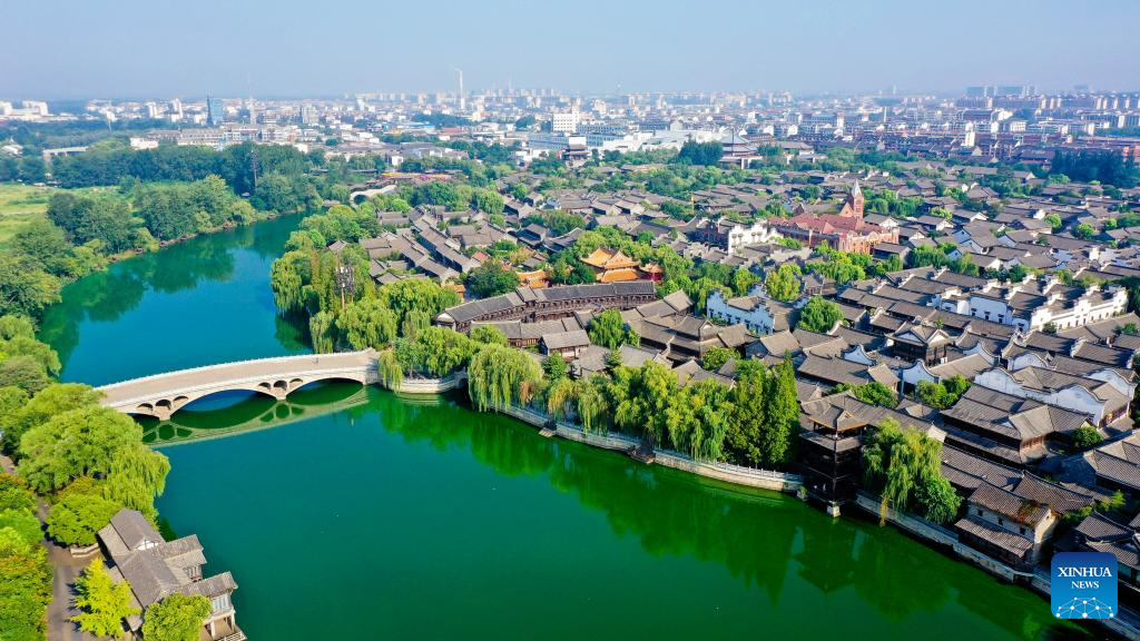 This aerial photo taken on Aug. 10, 2023 shows a view of the Taierzhuang ancient town along the Beijing-Hangzhou Grand Canal in Taierzhuang District of Zaozhuang City, east China's Shandong Province. The Grand Canal, a vast waterway connecting the northern and southern parts of China, flows through Zaozhuang City. In recent years, Taierzhuang District of Zaozhuang has been making every effort to promote ecological construction along the canal. (Xinhua/Guo Xulei)