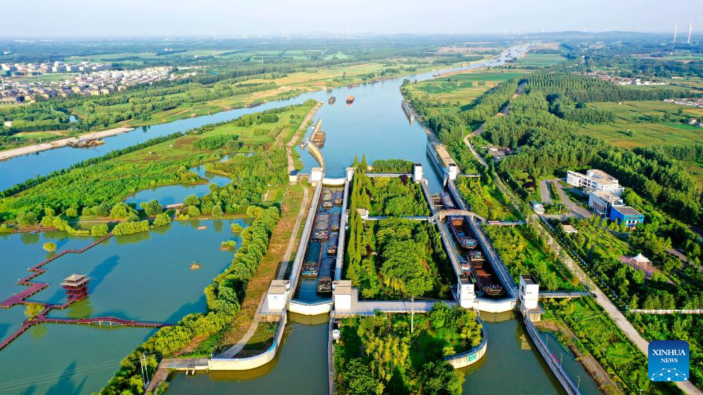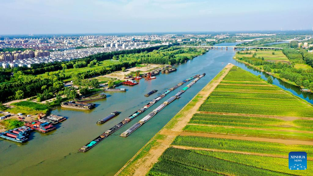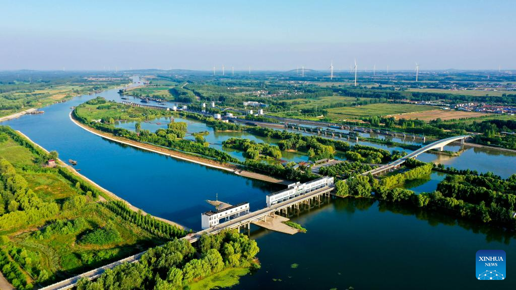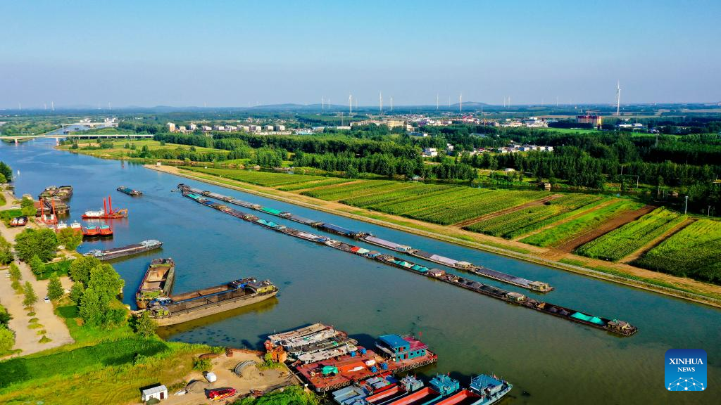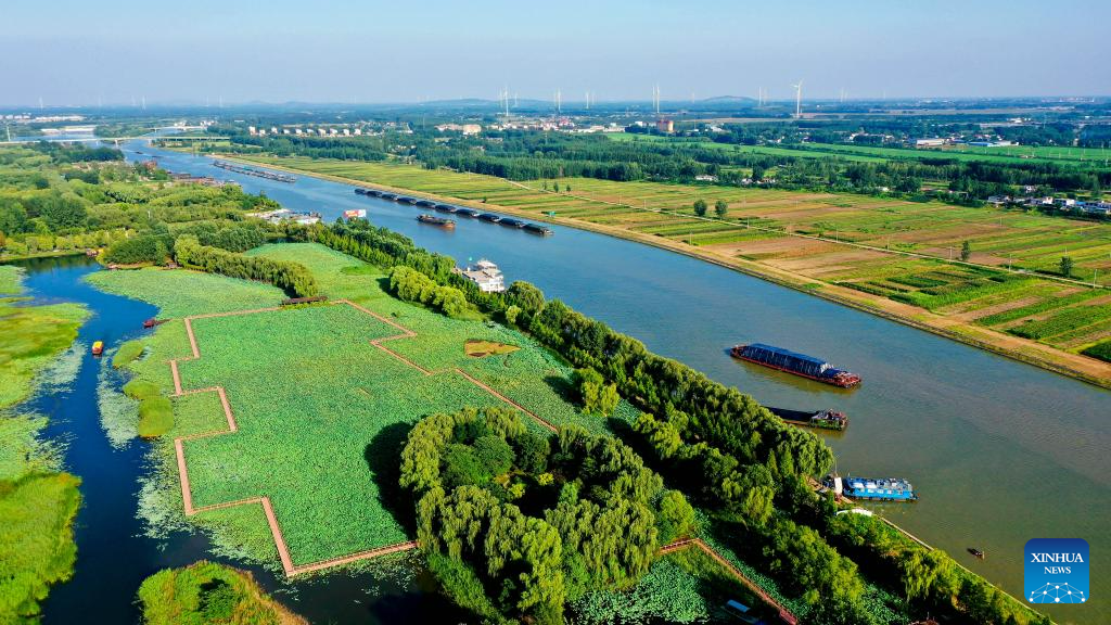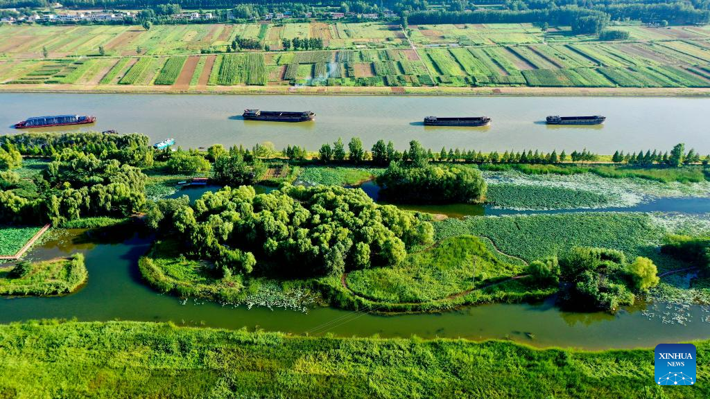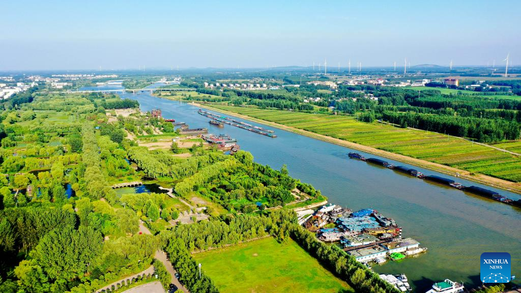 This aerial photo taken on Aug. 9, 2023 shows a view along the Zaozhuang section of the Beijing-Hangzhou Grand Canal in Taierzhuang District of Zaozhuang City, east China's Shandong Province. The Grand Canal, a vast waterway connecting the northern and southern parts of China, flows through Zaozhuang City. In recent years, Taierzhuang District of Zaozhuang has been making every effort to promote ecological construction along the canal. (Xinhua/Guo Xulei)