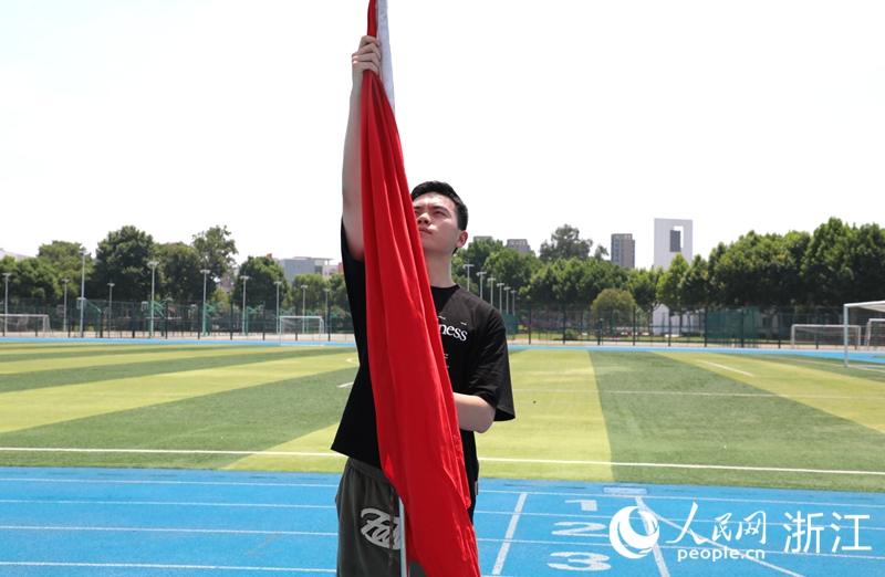 Liu, a student at the College of Information Engineering at Jinhua Polytechnic in east China's Zhejiang Province, was selected as a flag-raising volunteer for the 19th Hangzhou Asian Games. During the Games, he will be in charge of all the flag-raising ceremonies in the Jinhua Division.