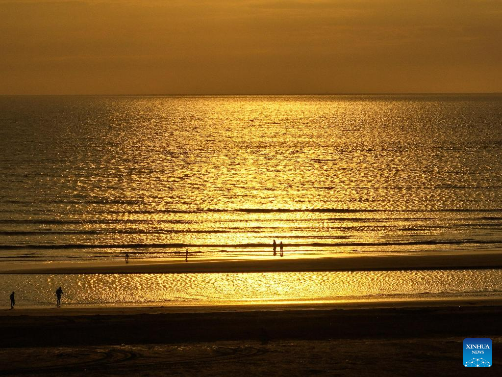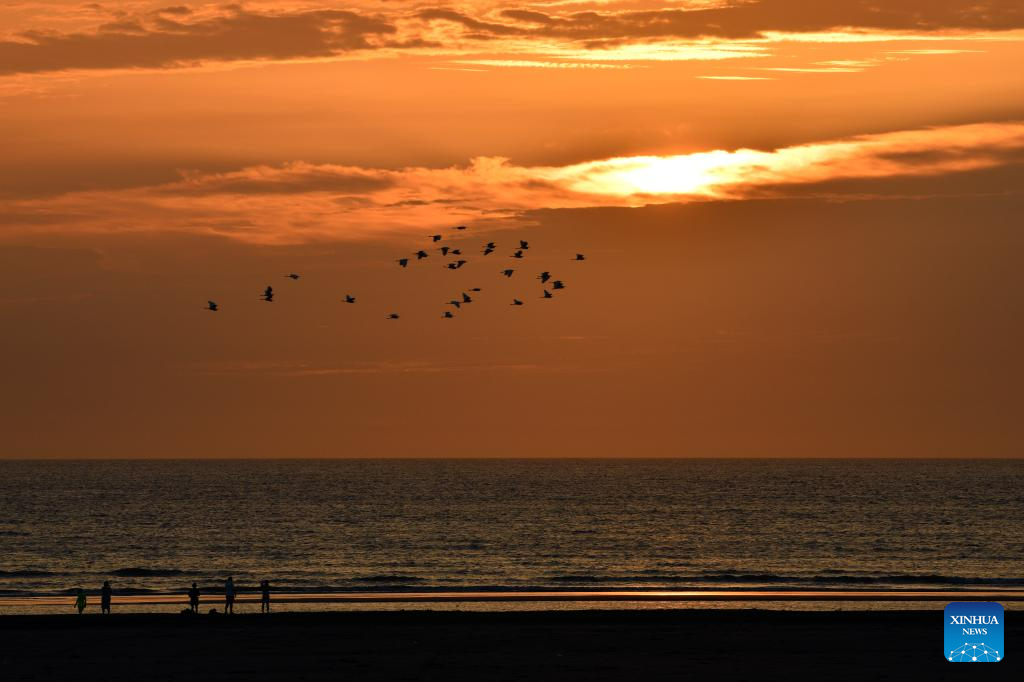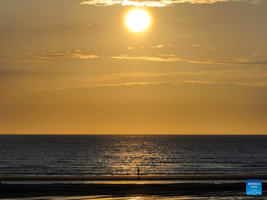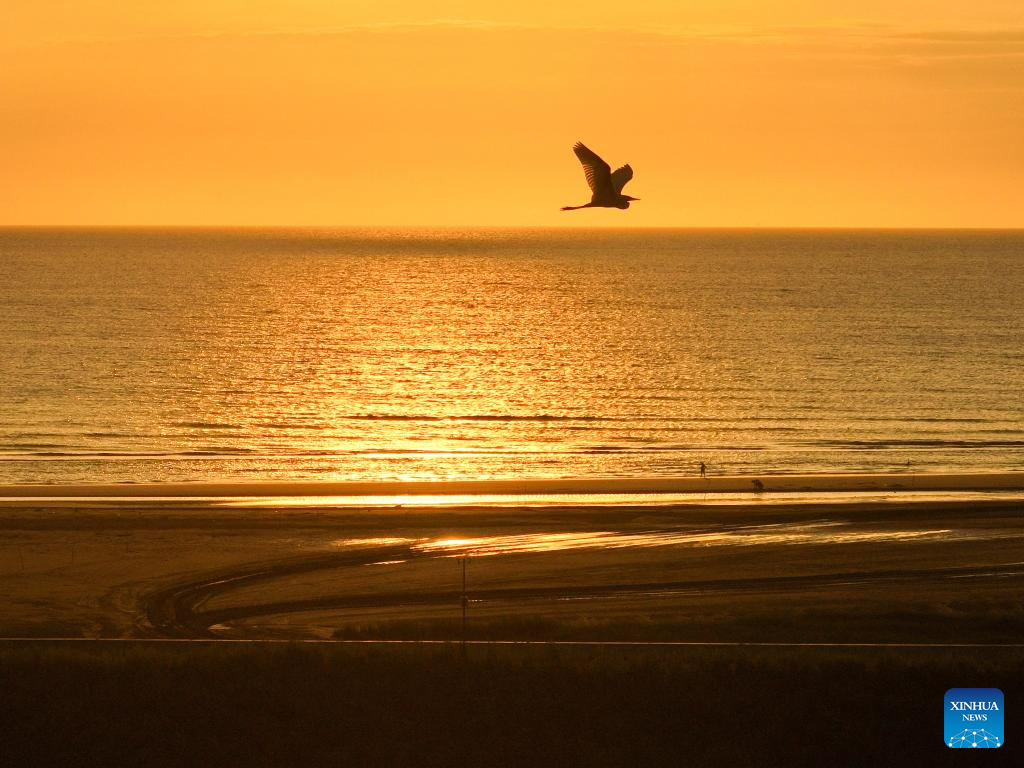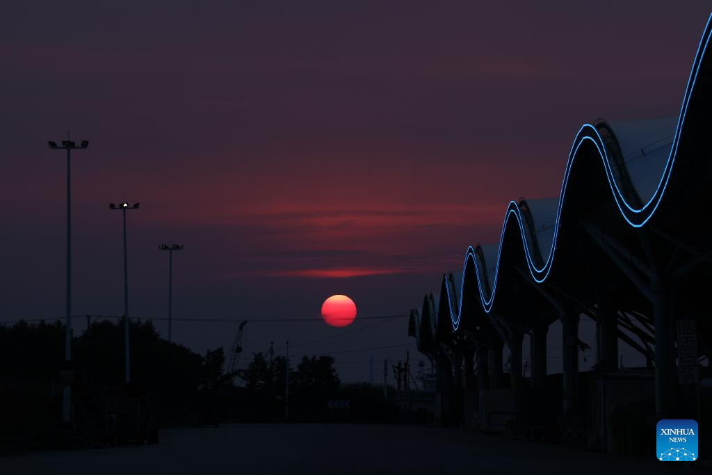 This photo taken on July 25, 2023 shows the sunrise scenery on a beach resort in Qidong, east China's Jiangsu Province. Chongming District and Pudong District of Shanghai, along with Qidong City of Jiangsu, are located in the estuary of Yangtze River. With its unique advantages, the region has been making concerted effort to further promote high-quality development. (Xinhua/Qian Yi)