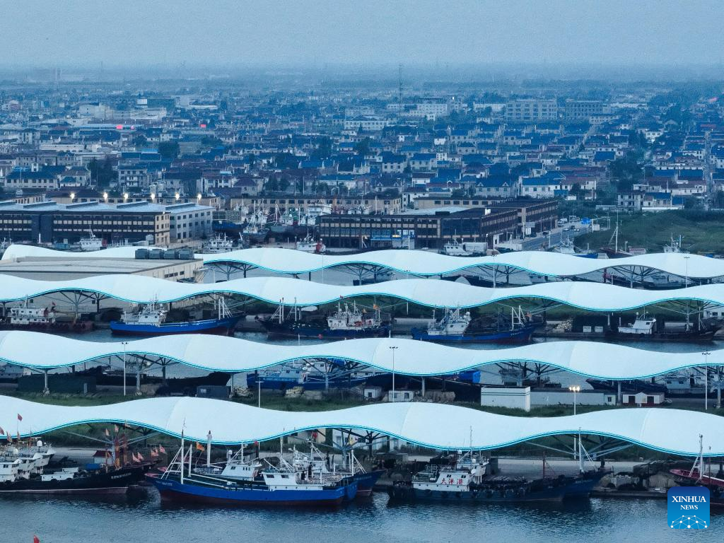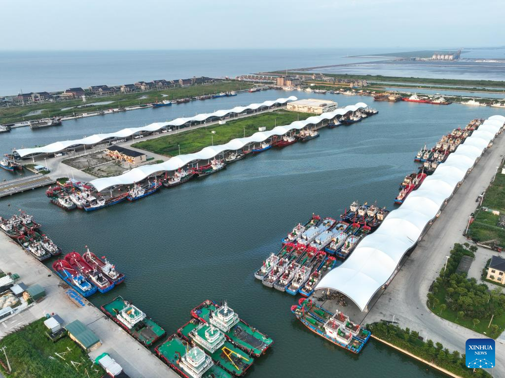 This aerial photo taken on July 24, 2023 shows a fishing port in Qidong, east China's Jiangsu Province. Chongming District and Pudong District of Shanghai, along with Qidong City of Jiangsu, are located in the estuary of Yangtze River. With its unique advantages, the region has been making concerted effort to further promote high-quality development. (Xinhua/Ji Chunpeng)
