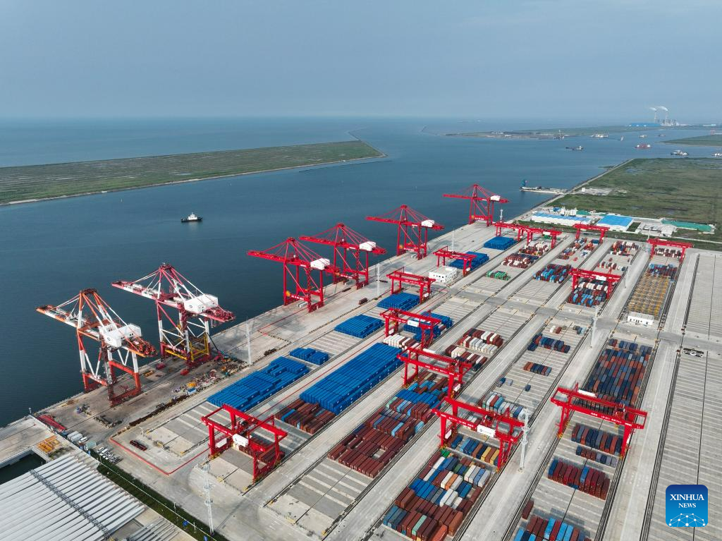 This aerial photo taken on July 24, 2023 shows a port in Qidong, east China's Jiangsu Province. Chongming District and Pudong District of Shanghai, along with Qidong City of Jiangsu, are located in the estuary of Yangtze River. With its unique advantages, the region has been making concerted effort to further promote high-quality development. (Xinhua/Ji Chunpeng)
