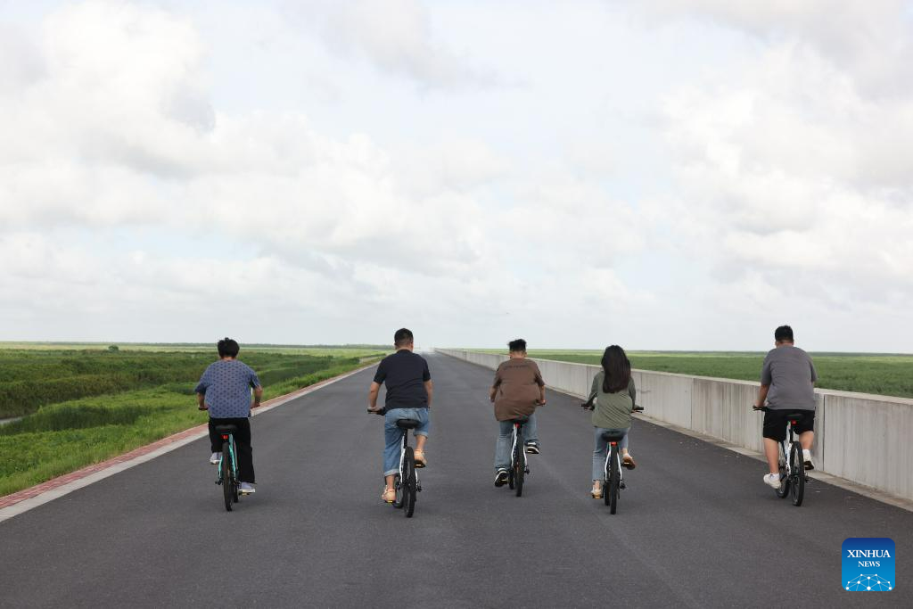 Tourists ride bikes on Hengsha island in Chongming District, east China's Shanghai, July 26, 2023. Chongming District and Pudong District of Shanghai, along with Qidong City of Jiangsu, are located in the estuary of Yangtze River. With its unique advantages, the region has been making concerted effort to further promote high-quality development. (Xinhua/Jin Liwang)