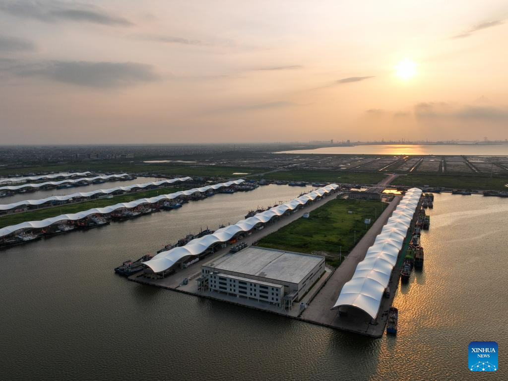 This photo taken on July 24, 2023 shows a sunset view of a fishing port in Qidong, east China's Jiangsu Province. Chongming District and Pudong District of Shanghai, along with Qidong City of Jiangsu, are located in the estuary of Yangtze River. With its unique advantages, the region has been making concerted effort to further promote high-quality development. (Xinhua/Jin Liwang)