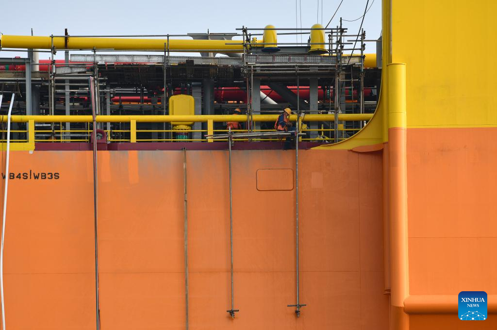 People work at a shipbuilding industrial park in Qidong, east China's Jiangsu Province, July 23, 2023. Chongming District and Pudong District of Shanghai, along with Qidong City of Jiangsu, are located in the estuary of Yangtze River. With its unique advantages, the region has been making concerted effort to further promote high-quality development. (Xinhua/Qian Yi)