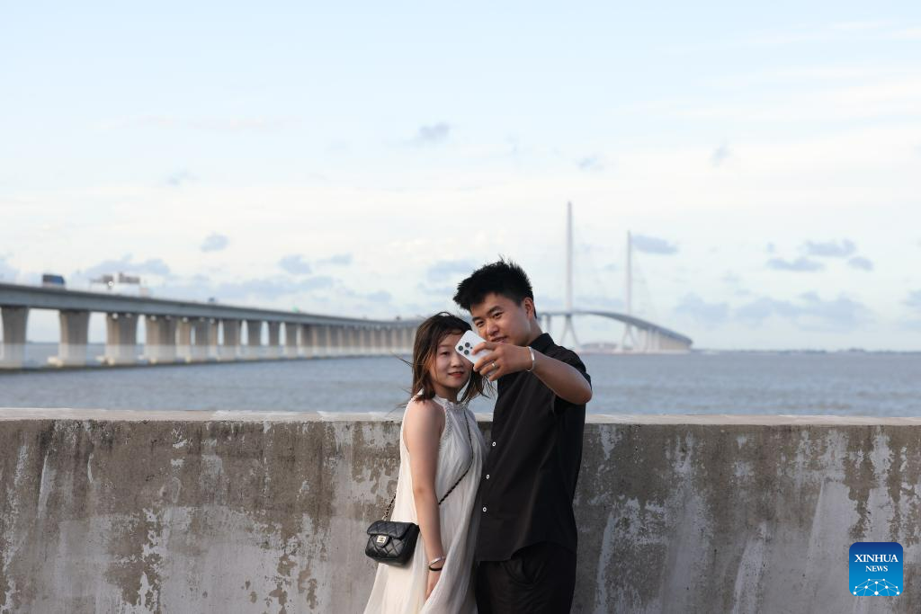 Visitors take selfies with the Shanghai Yangtze River Bridge as background in Shanghai, east China, July 25, 2023. Chongming District and Pudong District of Shanghai, along with Qidong City of Jiangsu, are located in the estuary of Yangtze River. With its unique advantages, the region has been making concerted effort to further promote high-quality development. (Xinhua/Jin Liwang)