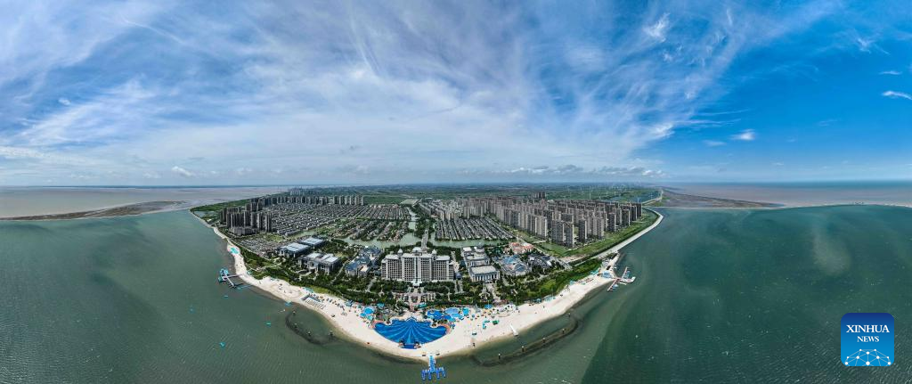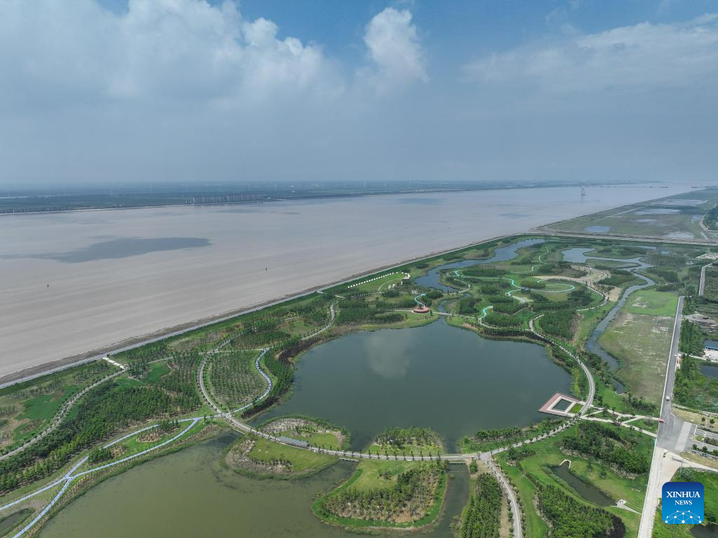 This aerial photo taken on Aug. 1, 2023 shows a view of a seaside park in Lingang Special Area in east China's Shanghai. Chongming District and Pudong District of Shanghai, along with Qidong City of Jiangsu, are located in the estuary of Yangtze River. With its unique advantages, the region has been making concerted effort to further promote high-quality development. (Xinhua/Fang Zhe)