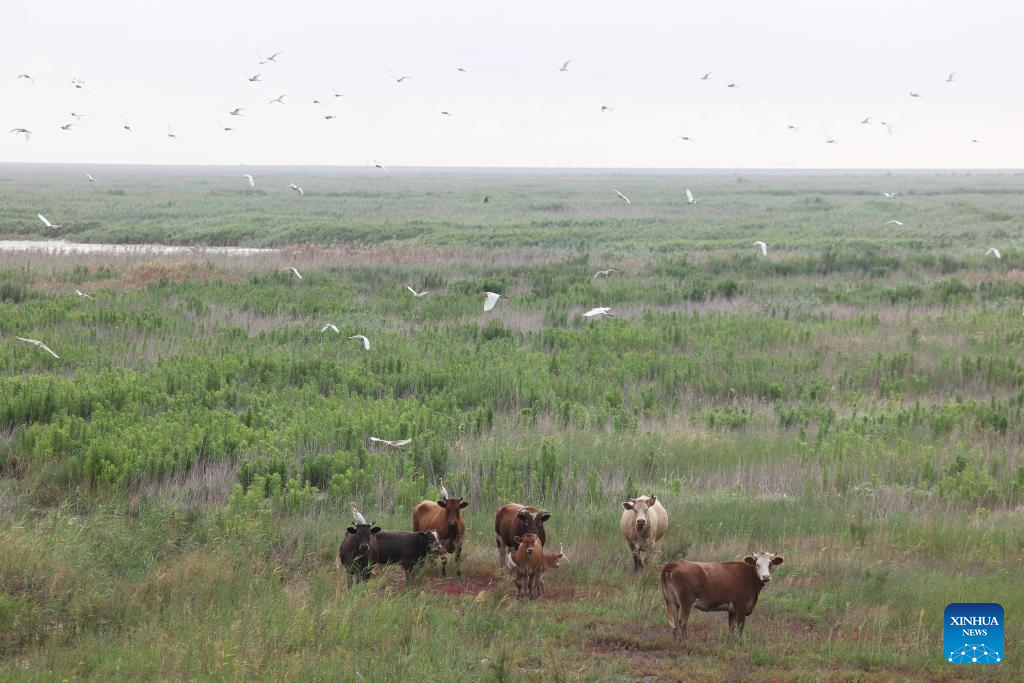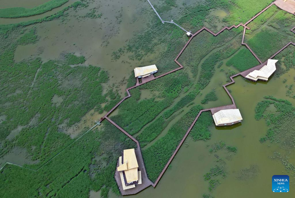 This aerial photo taken on June 14, 2023 shows the scenery of Shanghai Chongming Dongtan National Nature Reserve in Chongming District, east China's Shanghai. Chongming District and Pudong District of Shanghai, along with Qidong City of Jiangsu, are located in the estuary of Yangtze River. With its unique advantages, the region has been making concerted effort to further promote high-quality development. (Xinhua/Liu Ying)