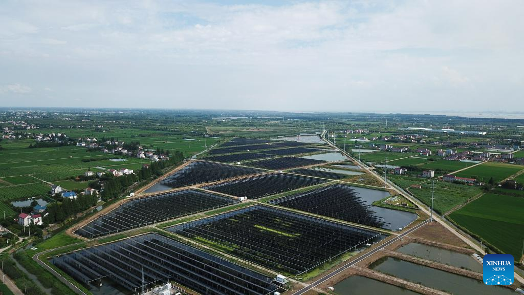 This aerial photo taken on July 25, 2023 shows a crab pond covered by photovoltaic panels in Huaxing Village of Chongming District, east China's Shanghai. Chongming District and Pudong District of Shanghai, along with Qidong City of Jiangsu, are located in the estuary of Yangtze River. With its unique advantages, the region has been making concerted effort to further promote high-quality development. (Xinhua/Jin Liwang)