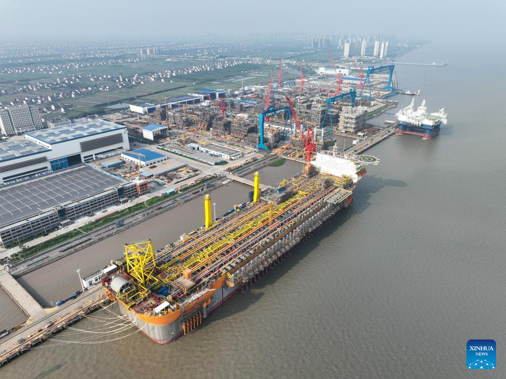 This aerial photo taken on July 23, 2023 shows a view of a shipbuilding industrial park in Qidong, east China's Jiangsu Province. Chongming District and Pudong District of Shanghai, along with Qidong City of Jiangsu, are located in the estuary of Yangtze River. With its unique advantages, the region has been making concerted effort to further promote high-quality development. (Xinhua/Ji Chunpeng)