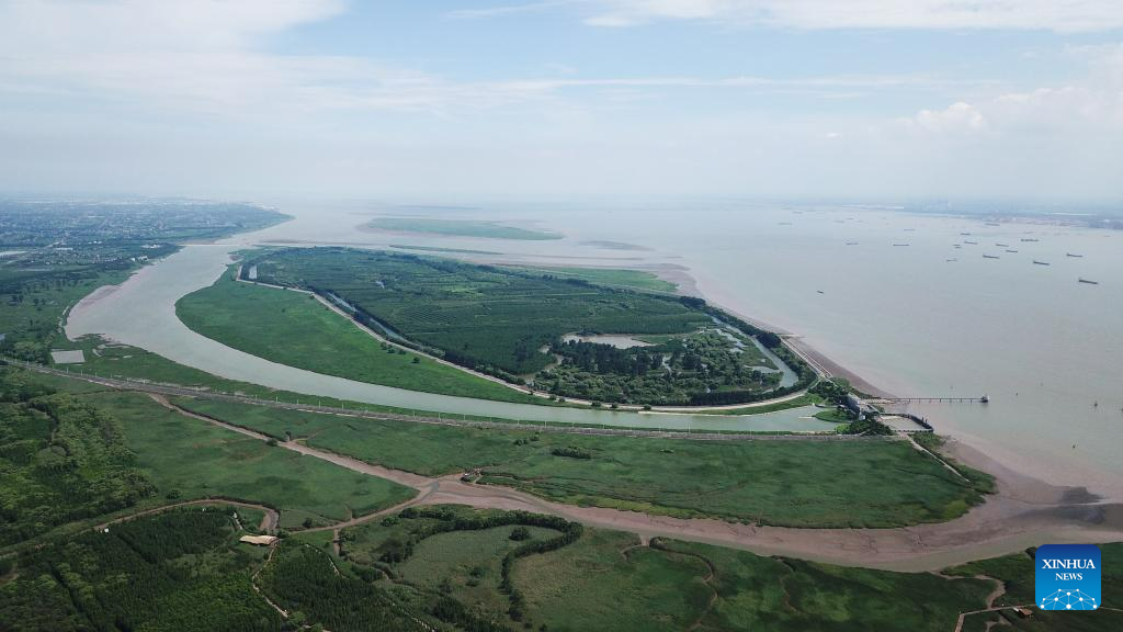 This photo taken on July 26, 2023 shows the scenery of Hengsha island in Chongming District, east China's Shanghai. Chongming District and Pudong District of Shanghai, along with Qidong City of Jiangsu, are located in the estuary of Yangtze River. With its unique advantages, the region has been making concerted effort to further promote high-quality development. (Xinhua/Jin Liwang)