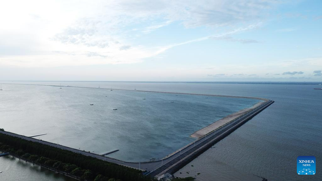 This aerial photo taken on July 25, 2023 shows the Qingcaosha Reservoir in Changxing island of Chongming District, east China's Shanghai. Chongming District and Pudong District of Shanghai, along with Qidong City of Jiangsu, are located in the estuary of Yangtze River. With its unique advantages, the region has been making concerted effort to further promote high-quality development. (Xinhua/Jin Liwang)