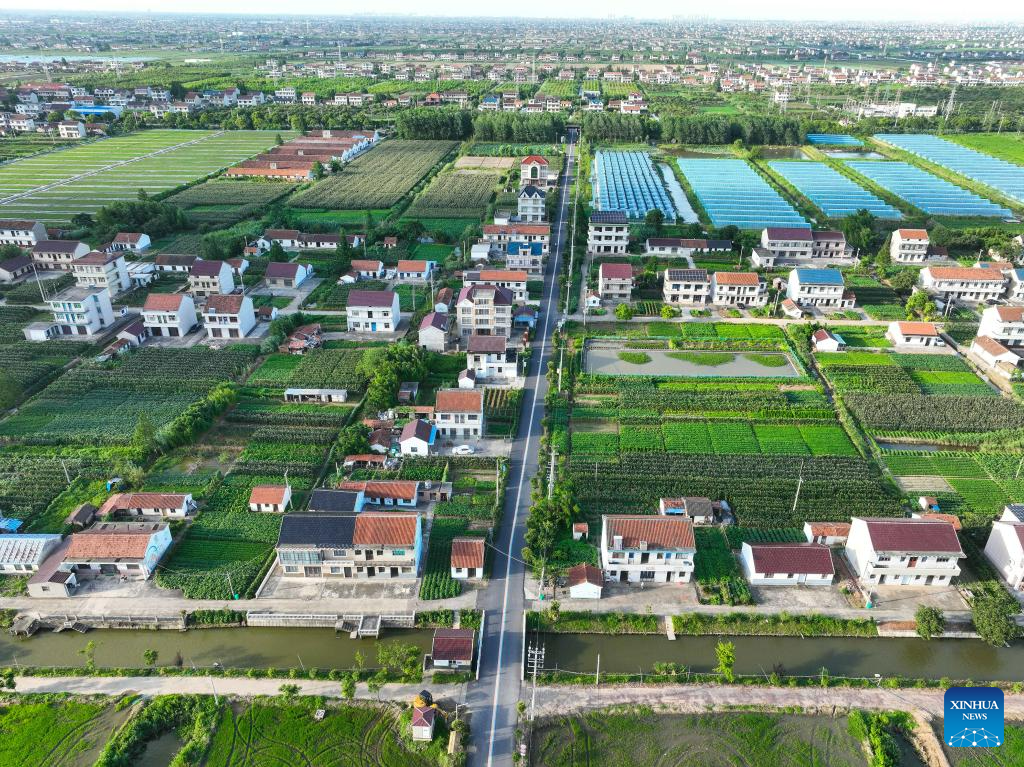 This aerial photo taken on July 25, 2023 shows a view of Dongxingzhen Village of Huiping Town in Qidong, east China's Jiangsu Province. Chongming District and Pudong District of Shanghai, along with Qidong City of Jiangsu, are located in the estuary of Yangtze River. With its unique advantages, the region has been making concerted effort to further promote high-quality development. (Xinhua/Ji Chunpeng)