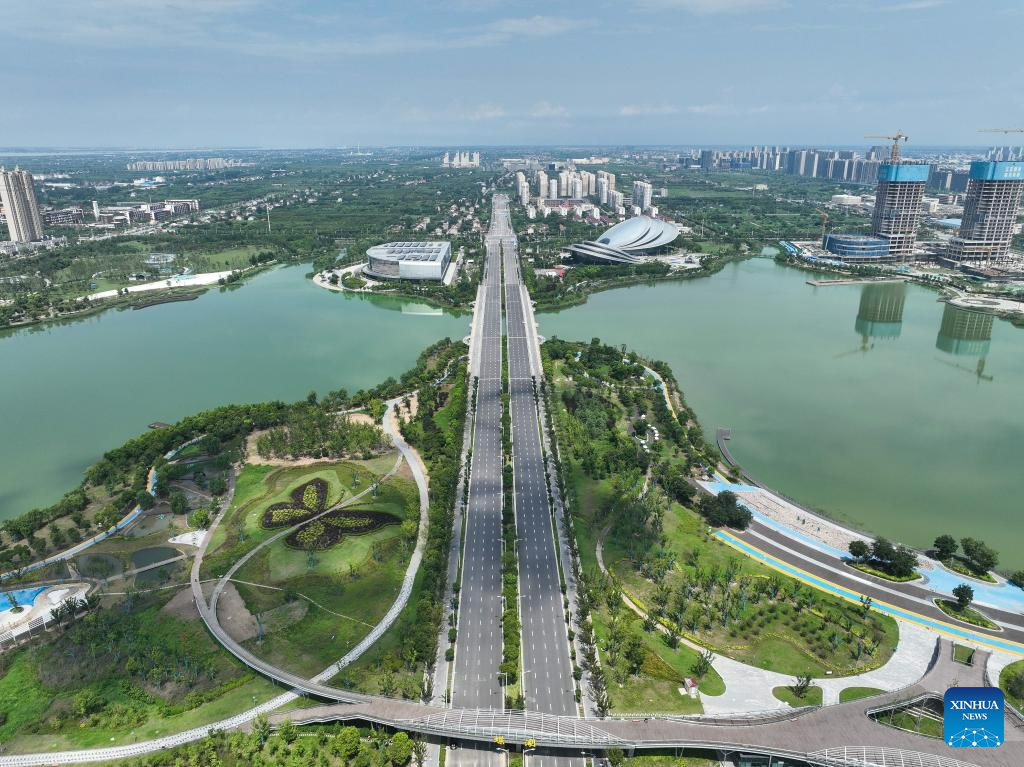This aerial photo taken on July 24, 2023 shows a view of Diehu park in Qidong, east China's Jiangsu Province. Chongming District and Pudong District of Shanghai, along with Qidong City of Jiangsu, are located in the estuary of Yangtze River. With its unique advantages, the region has been making concerted effort to further promote high-quality development. (Xinhua/Ji Chunpeng)