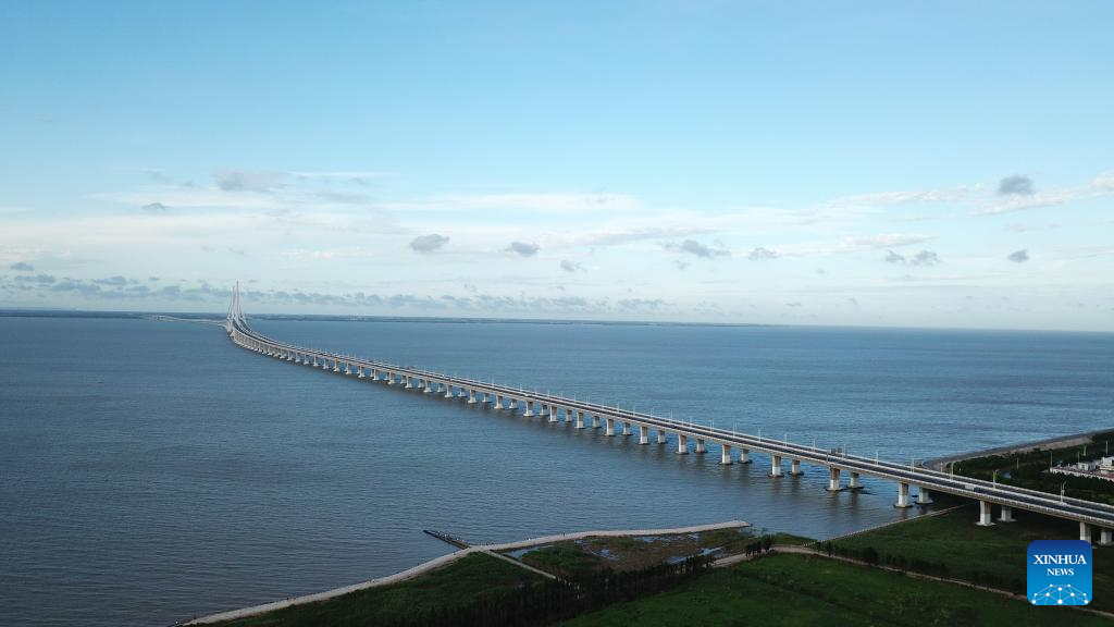 This aerial photo taken on July 25, 2023 shows the Shanghai Yangtze River Bridge in Shanghai, east China. Chongming District and Pudong District of Shanghai, along with Qidong City of Jiangsu, are located in the estuary of Yangtze River. With its unique advantages, the region has been making concerted effort to further promote high-quality development. (Xinhua/Jin Liwang)