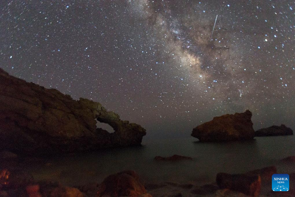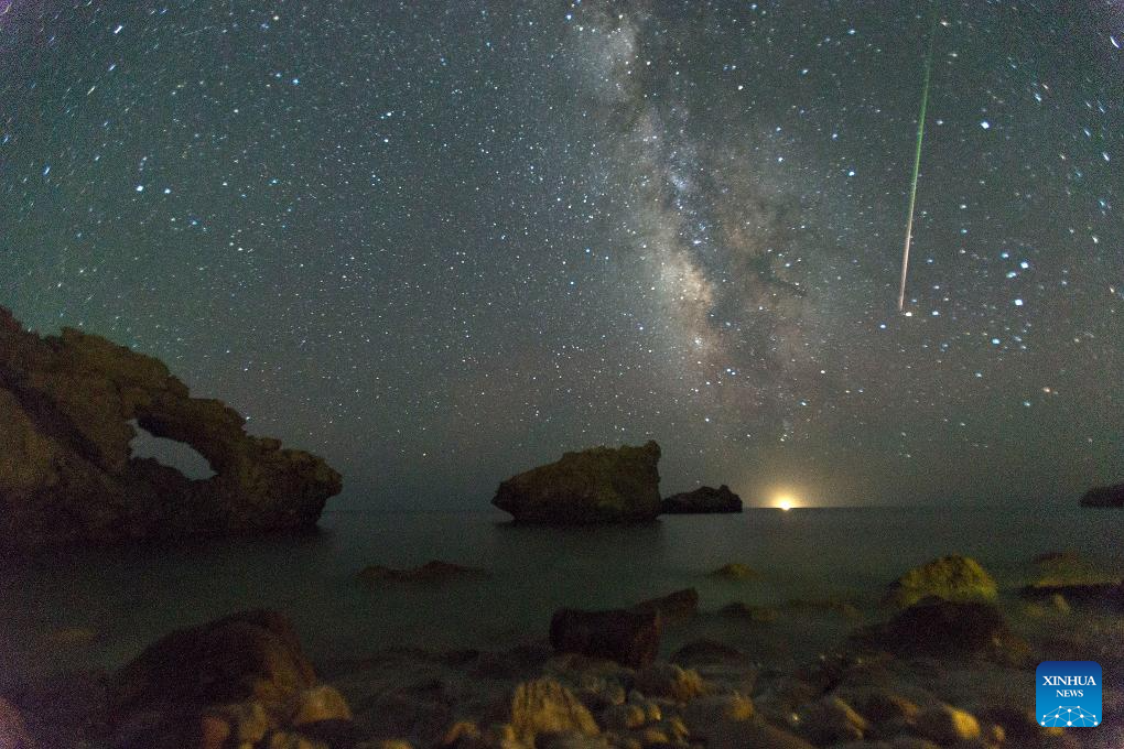Photo taken on Aug. 12, 2023 shows the Perseid meteor shower seen from Gavdos island, Greece. (Xinhua/Marios Lolos)
