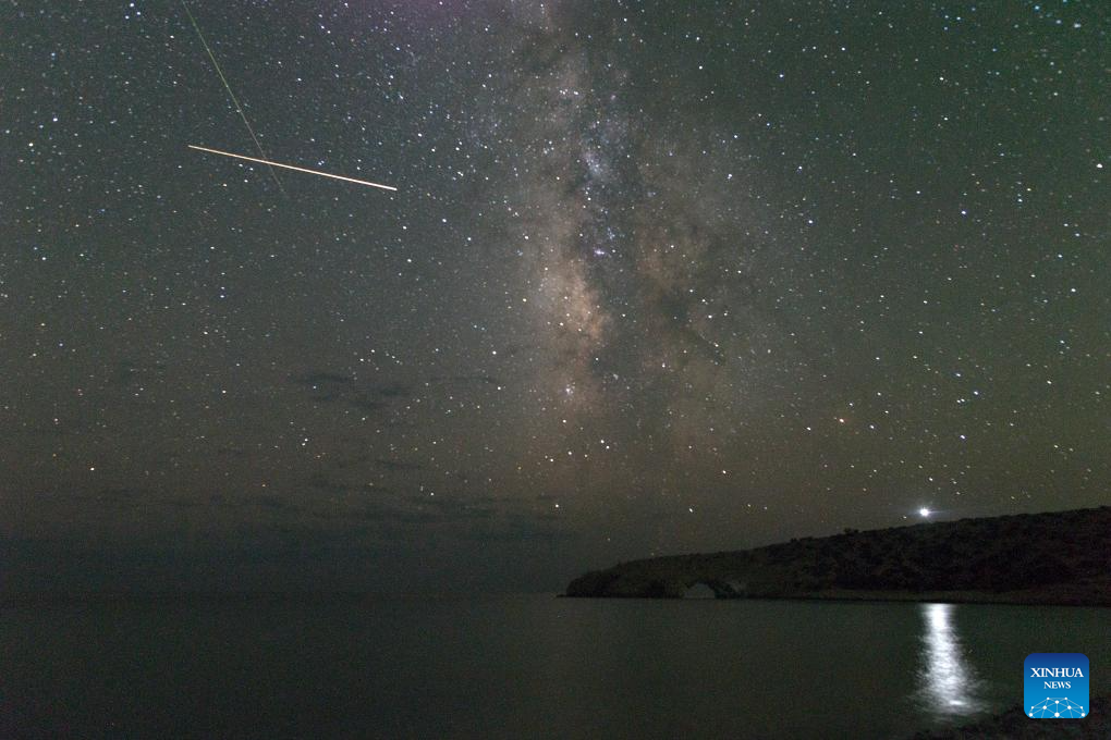 Photo taken on Aug. 13, 2023 shows the Perseid meteor shower seen from Gavdos island, Greece. (Xinhua/Marios Lolos)